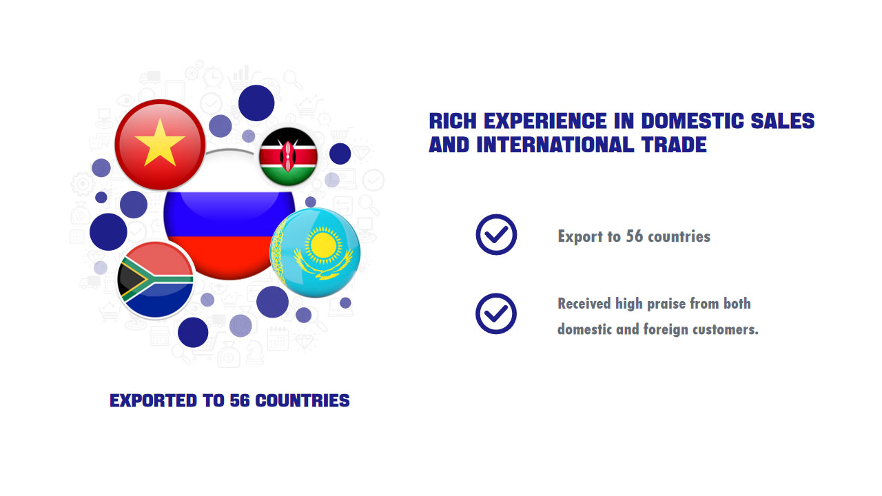 With extensive experience in domestic sales and international trade, our products have been exported to 56 countries, including Kenya, South Africa, Kazakhstan, Russia, and Vietnam, and have been well-received by customers both at home and abroad.