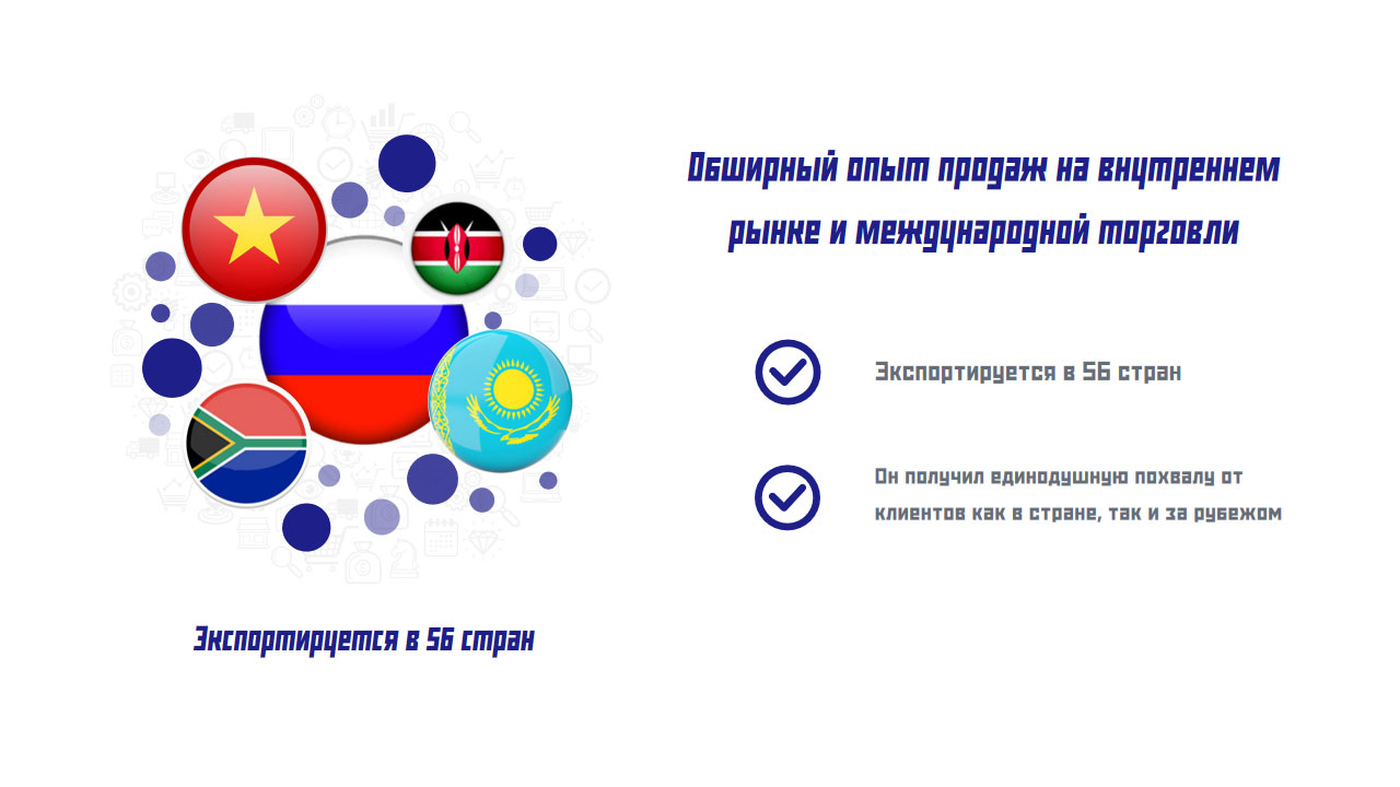 Имея богатый опыт в сфере внутренней продажи и международной торговли, мы экспортировали нашу продукцию в 56 стран, включая Кению, Южную Африку, Казахстан, Россию и Вьетнам. Наши изделия получили высокую оценку клиентов как в Китае, так и за рубежом.